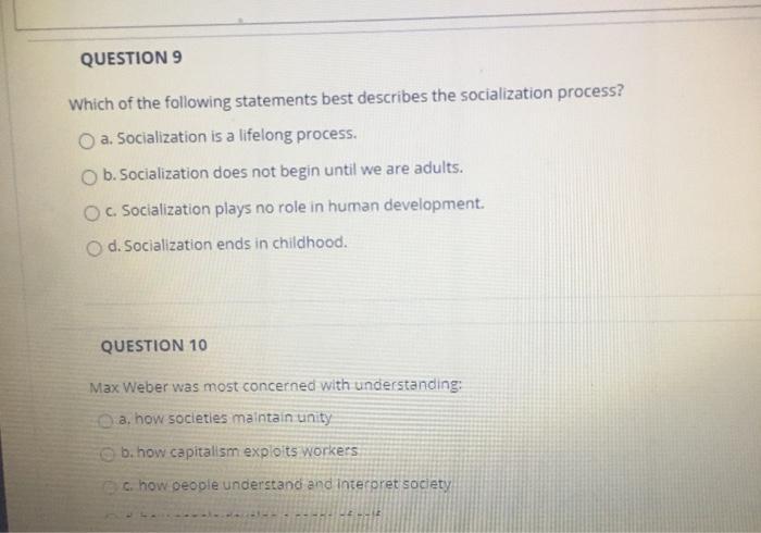Question 8 0 out of 1 points The definition for socialization is Selected Answer. Socialization is related to the assimilation of cultural habits as well as to the social learning of the subjects. Family is usually considered to be the most important agent of.